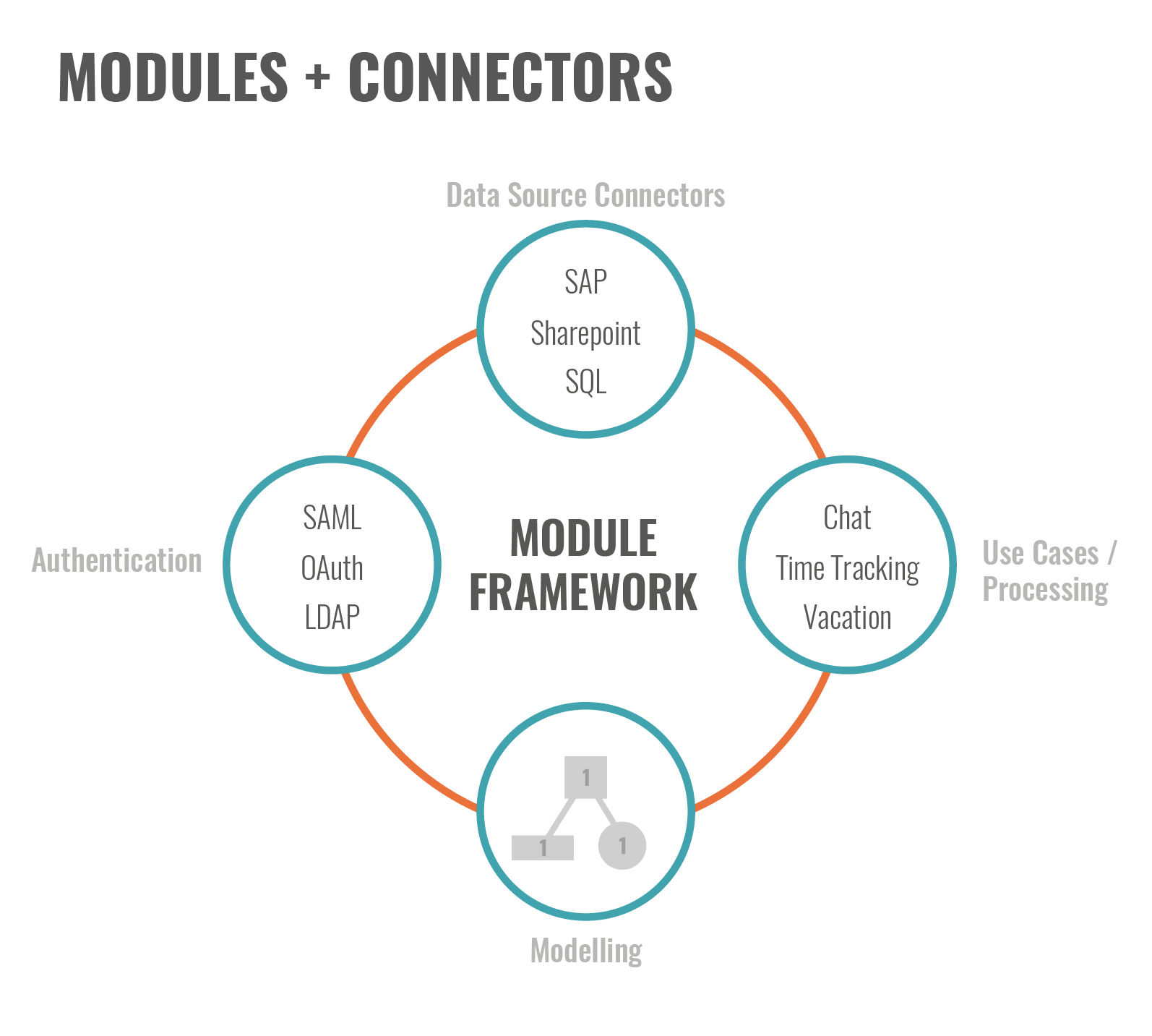 Use out-of-the-box modules and connectors to access data sources, implement authentication and write your app’s backend logic.