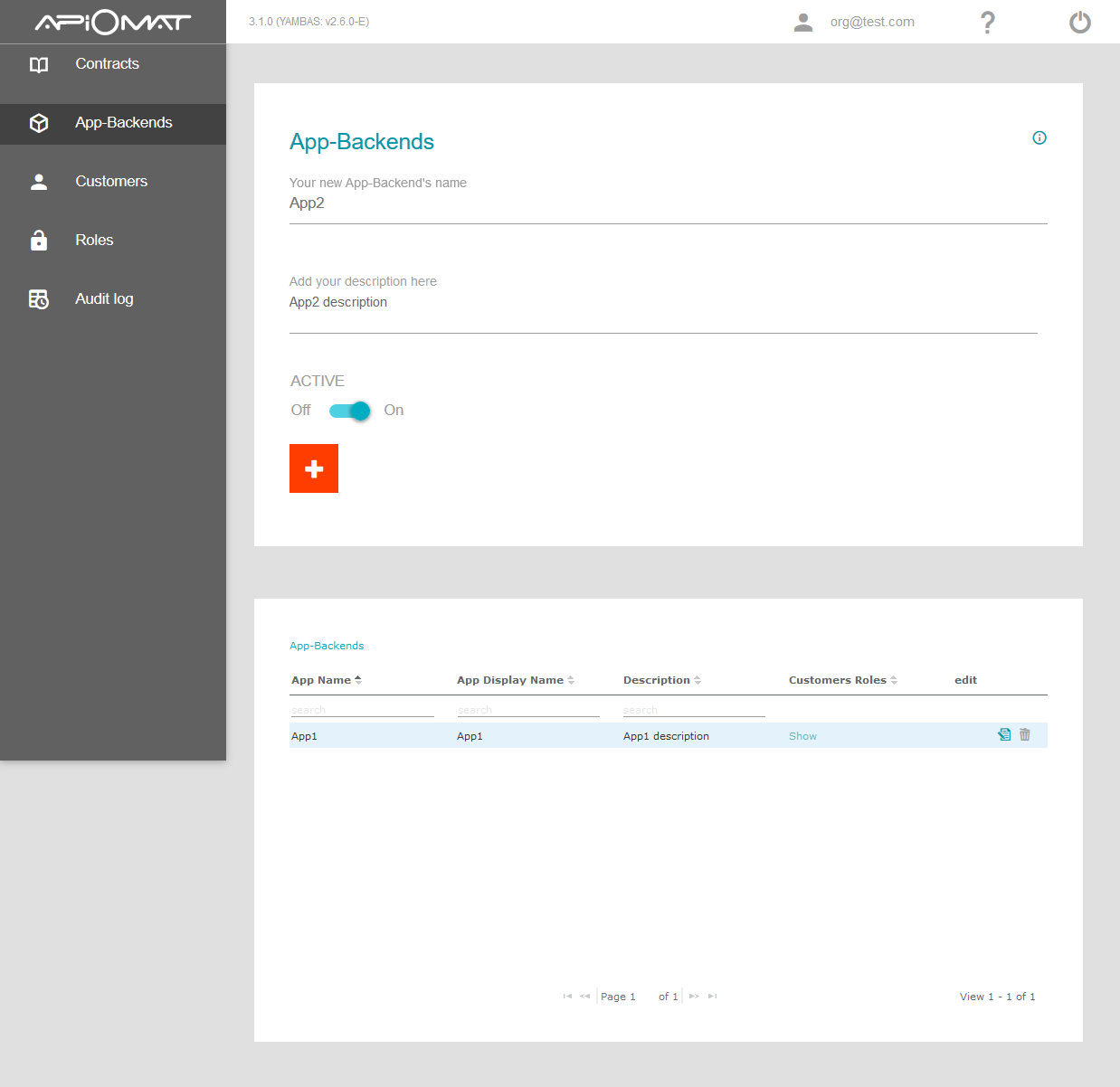 Organization can manage (create, delete, update) App-Backends. On this page all organization-apps will be listed with their names and descriptions. When editing an App-Backend more information will be shown e.g. active state of each system, apiKey,...