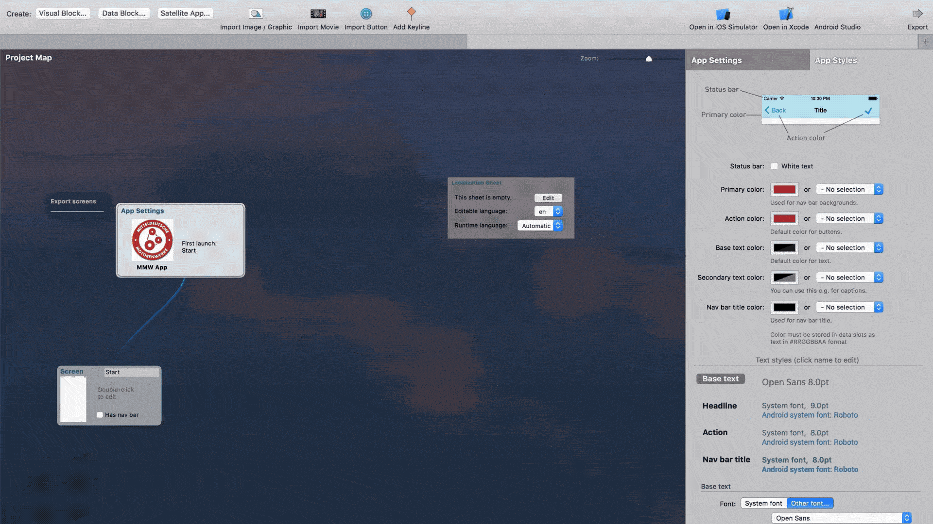 Every project in ApiOmat Studio has a default screen named "Start" that is displayed on the Project Map. By clicking on the screen name we can change it and if we double click on the screen element, we open the screen editor.