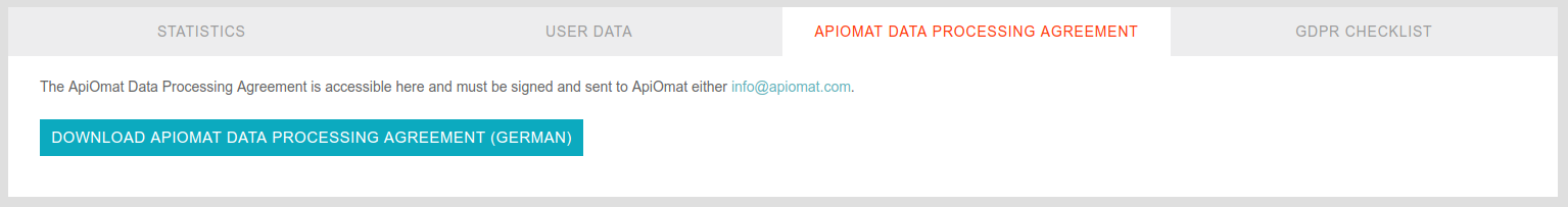 Here you can ensure that your app is developed and maintained as a GDPR compliant solution. You can download the ApiOmat Data Processing Agreement and then return it to ApiOmat. The GDPR Checklist helps developers ensure your app, website, chatbots etc. are built and maintained in a GDPR-compliant manner.