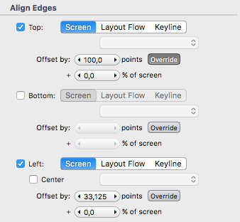 By default, an element has alignments only on top and left. Alignment offsets can be specified in physical units (points) or percentages. This is how elements are always placed in ApiOmat Studio: when you drag an element, it changes the alignment offsets.