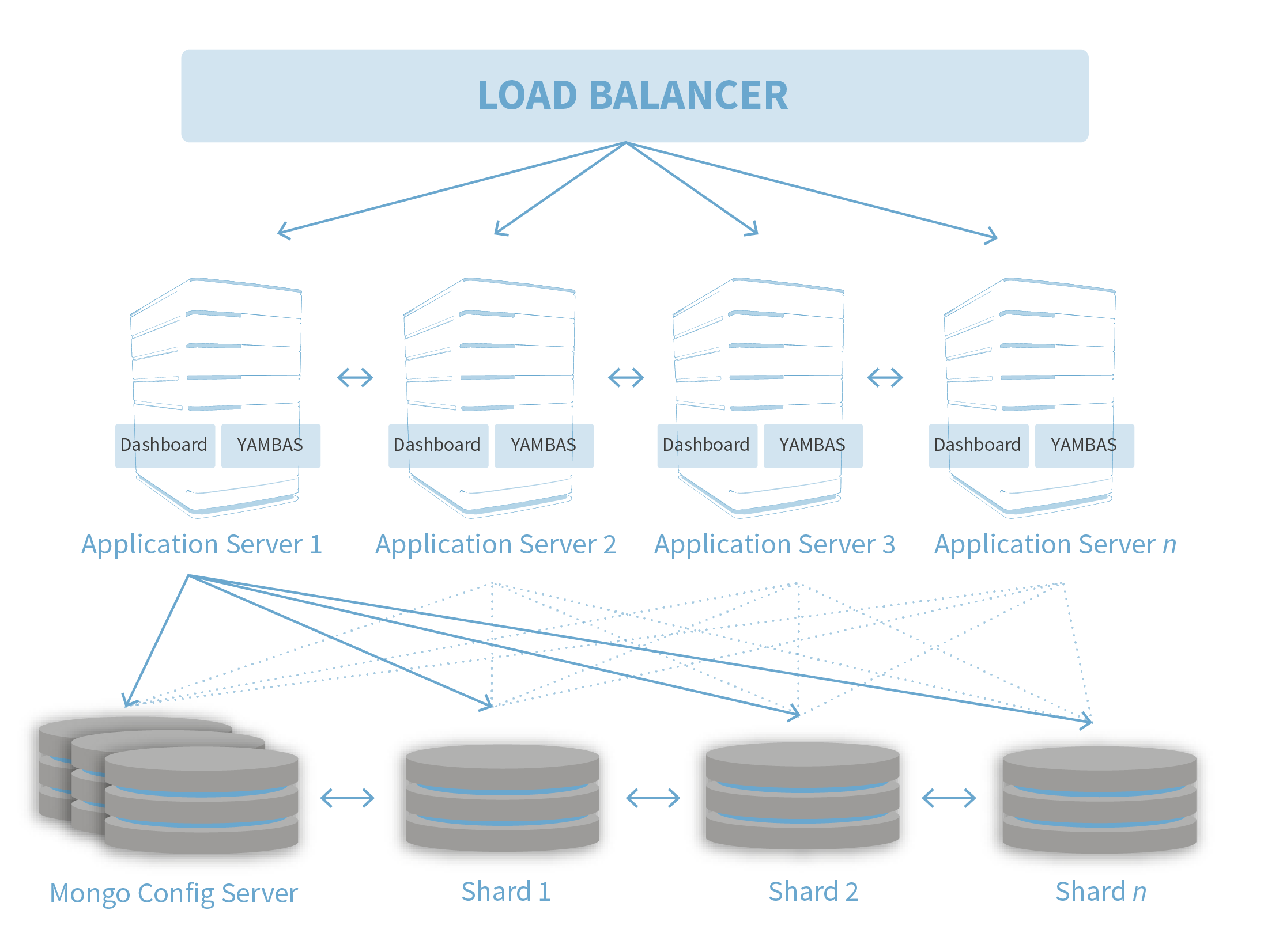 Hence, each application server handles requests in nearly every case all on its own by connecting to the database or the caching layer. Furthermore, the visual component (Dashboard) can be completely separated from the core (YAMBAS) installation.